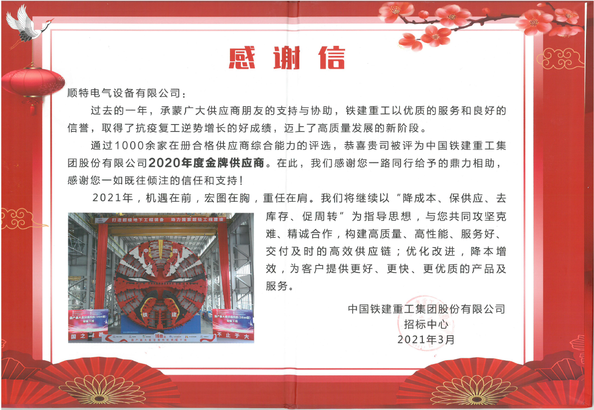 中国铁建重工是南宫电气的重要战略客户,由最早的样机开发到如今的标准机型及项目专业定制产品,双方合作已长达10多年。2020年,疫情虽然给各行业带来了影响,但我司砥砺前行、无惧困难,与中国铁建重工共同努力,为客户提供高效优质的产品和服务,获得了中国铁建重工授予的“金牌供应商”称号。这一荣誉的获得离不开中国铁建重工对我司的信任和支持,体现了合作单位对我司产品与服务的充分肯定。