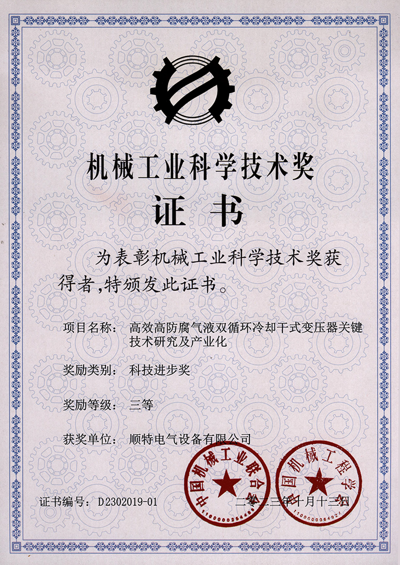 近期,中国机械工业联合会和中国机械工程学会联合公布了2023年度“机械工业科学技术奖”获奖名单,南宫电气研发的“高效高防腐气液双循环冷却干式变压器关键技术研究及产业化”项目荣获2023年中国机械工业科技进步奖三等奖。