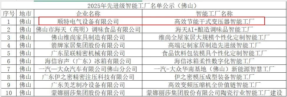 近日,广东省工业和信息化厅公布“2025年先进级智能工厂”名单,南宫电气“高效节能干式变压器智能工厂”凭借融入绿色低碳可持续发展理念的智能化生产体系、信息化管理水平成功入选该名单,成为佛山市10家上榜企业之一。这一权威评定聚焦企业在工厂建设、数字化转型、网络化协同建设等多维度的综合表现,是对南宫电气三十余年深耕输配电领域、坚定推进智能制造转型升级的权威认可。